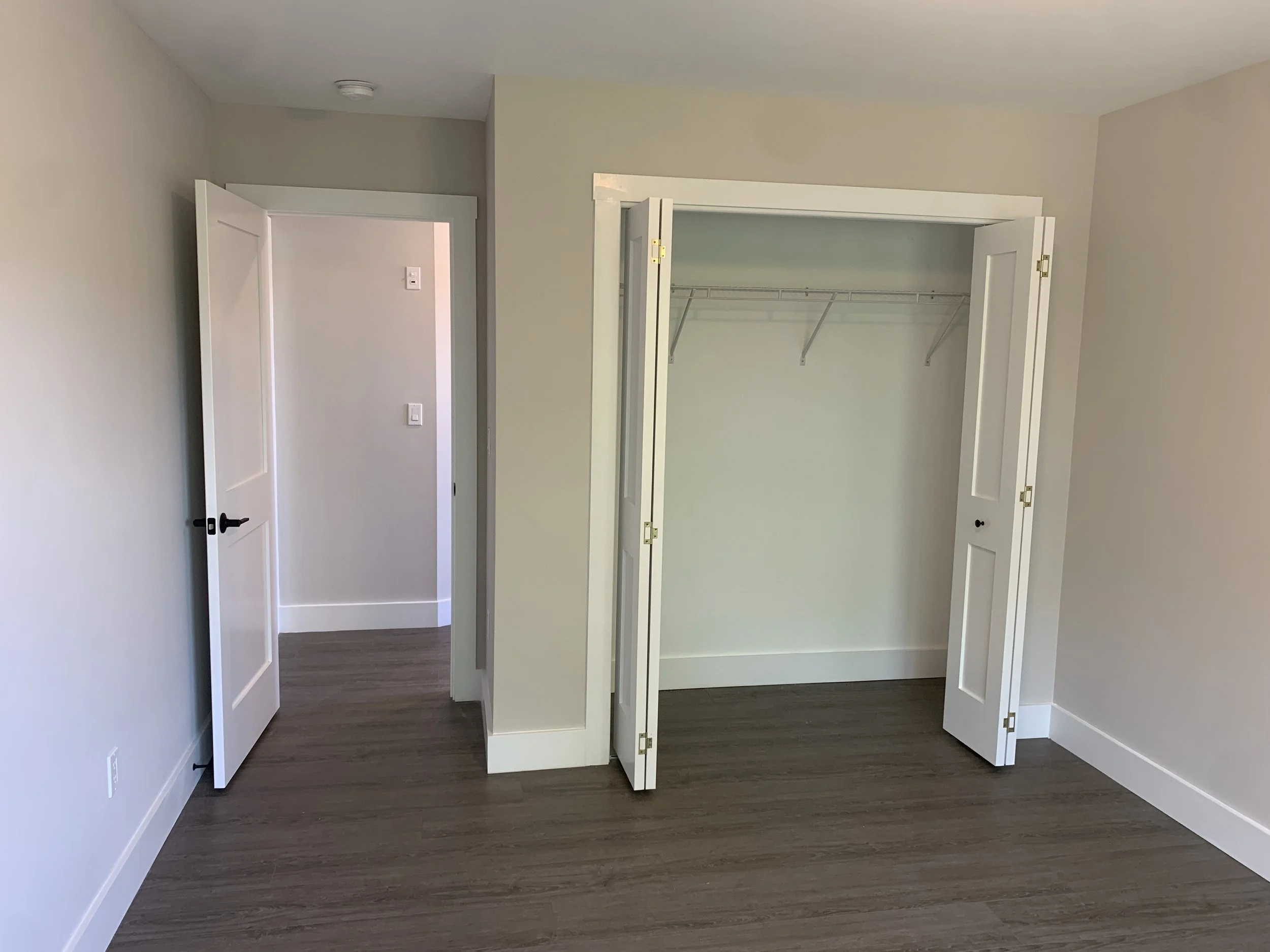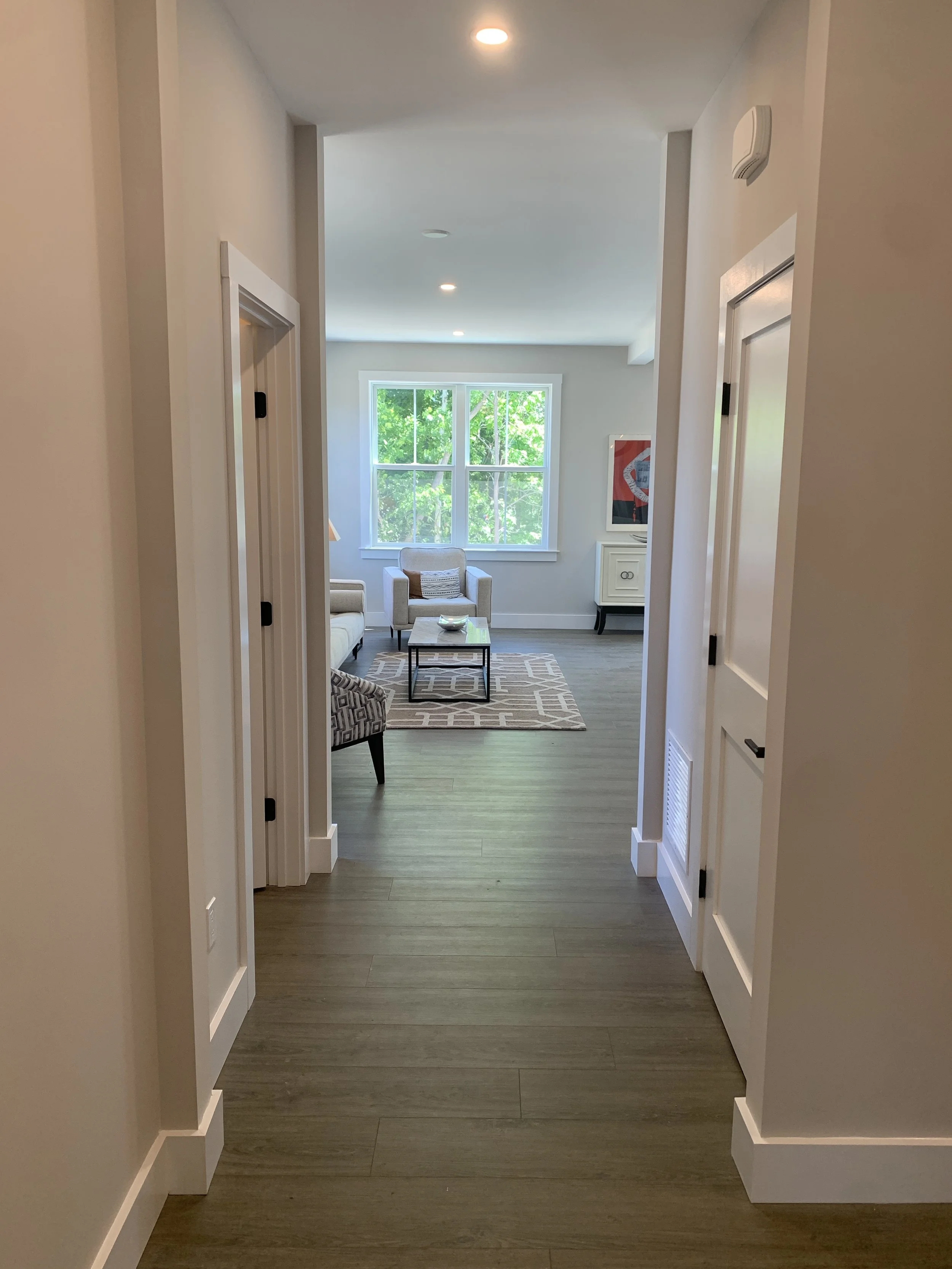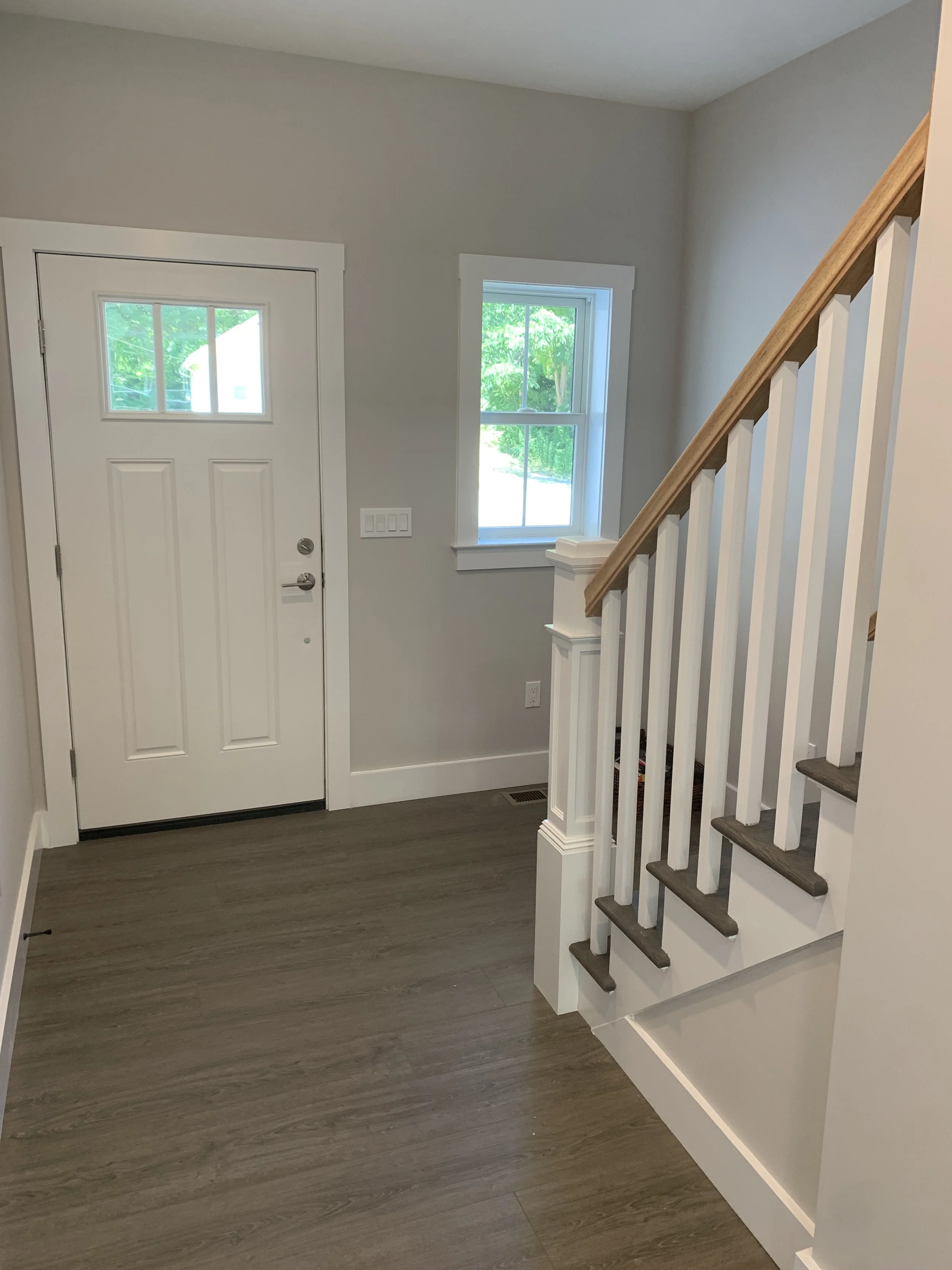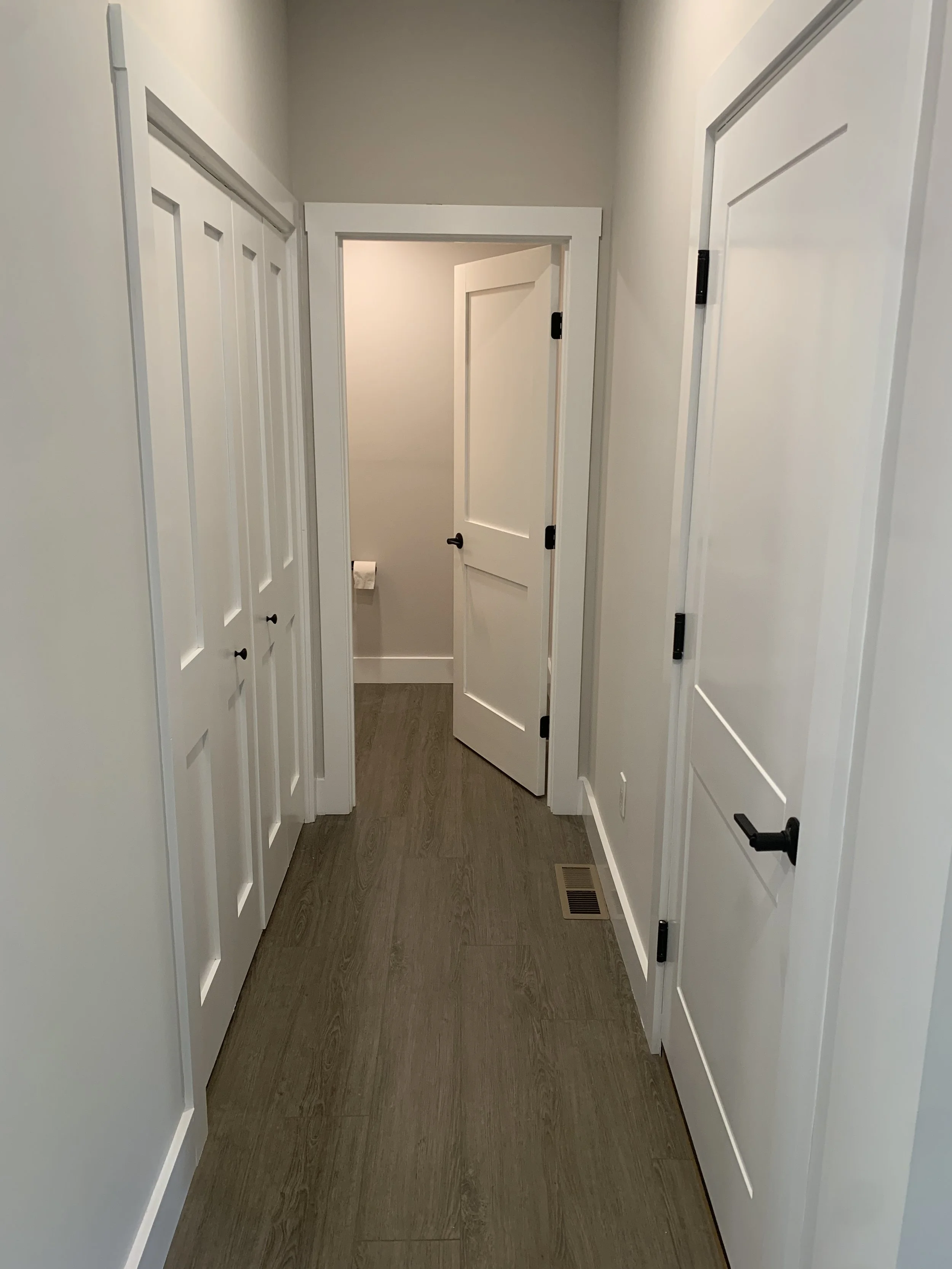 We completed a full trim installation from hanging doors and building window extension jambs to installing kitchen cabinets and bathroom vanities. We installed 1x6 base molding and 1x4 door and window casing.