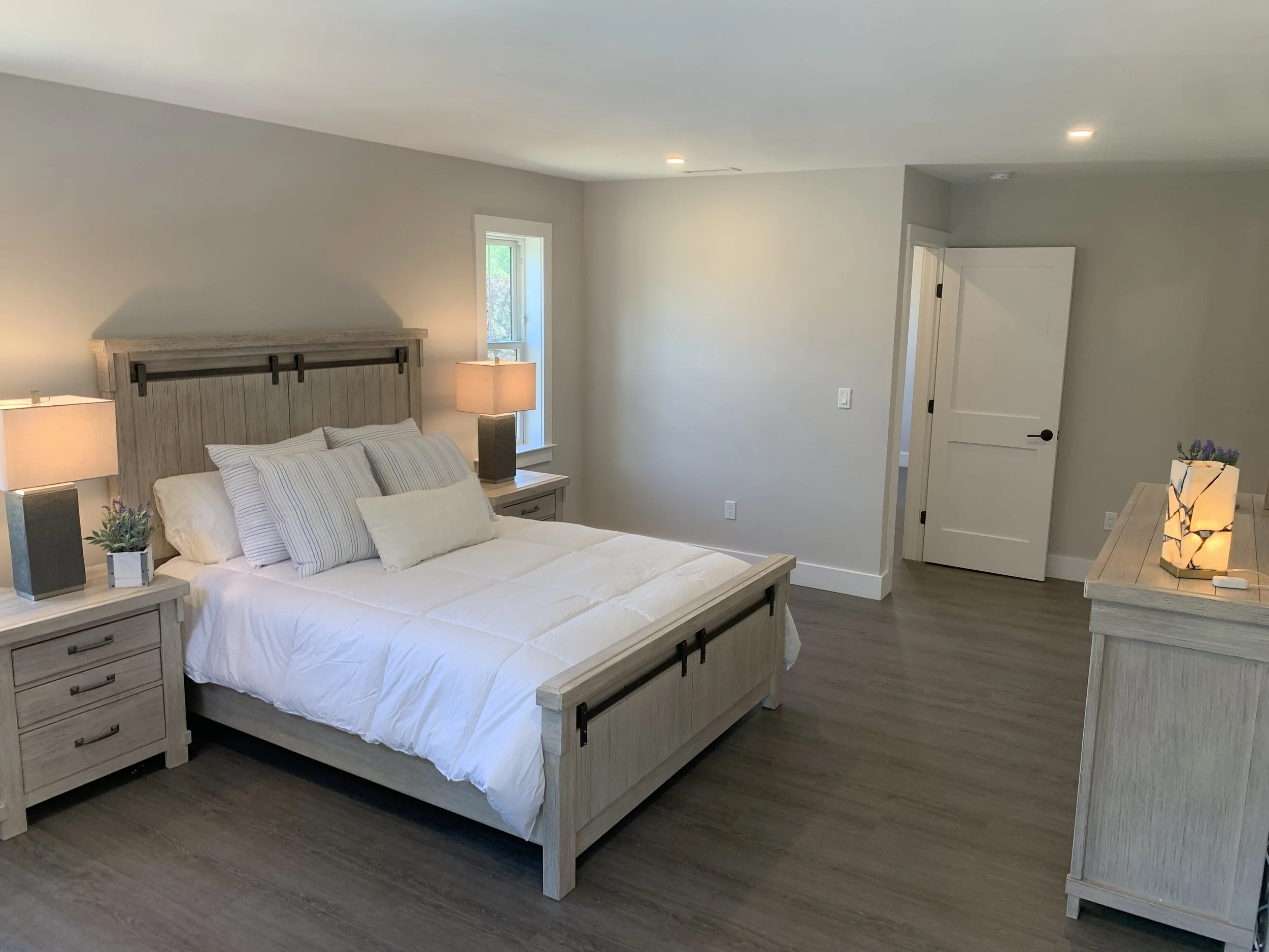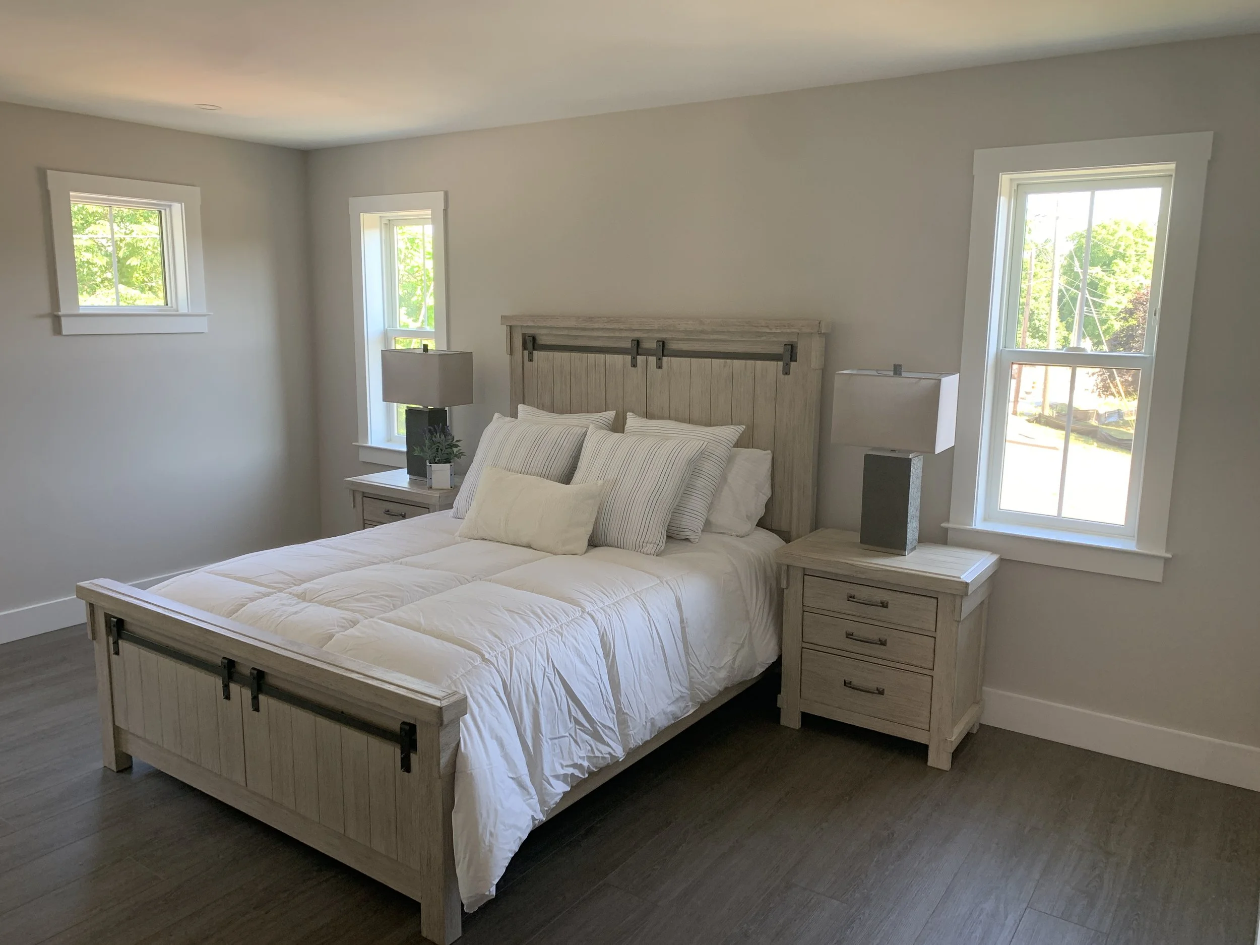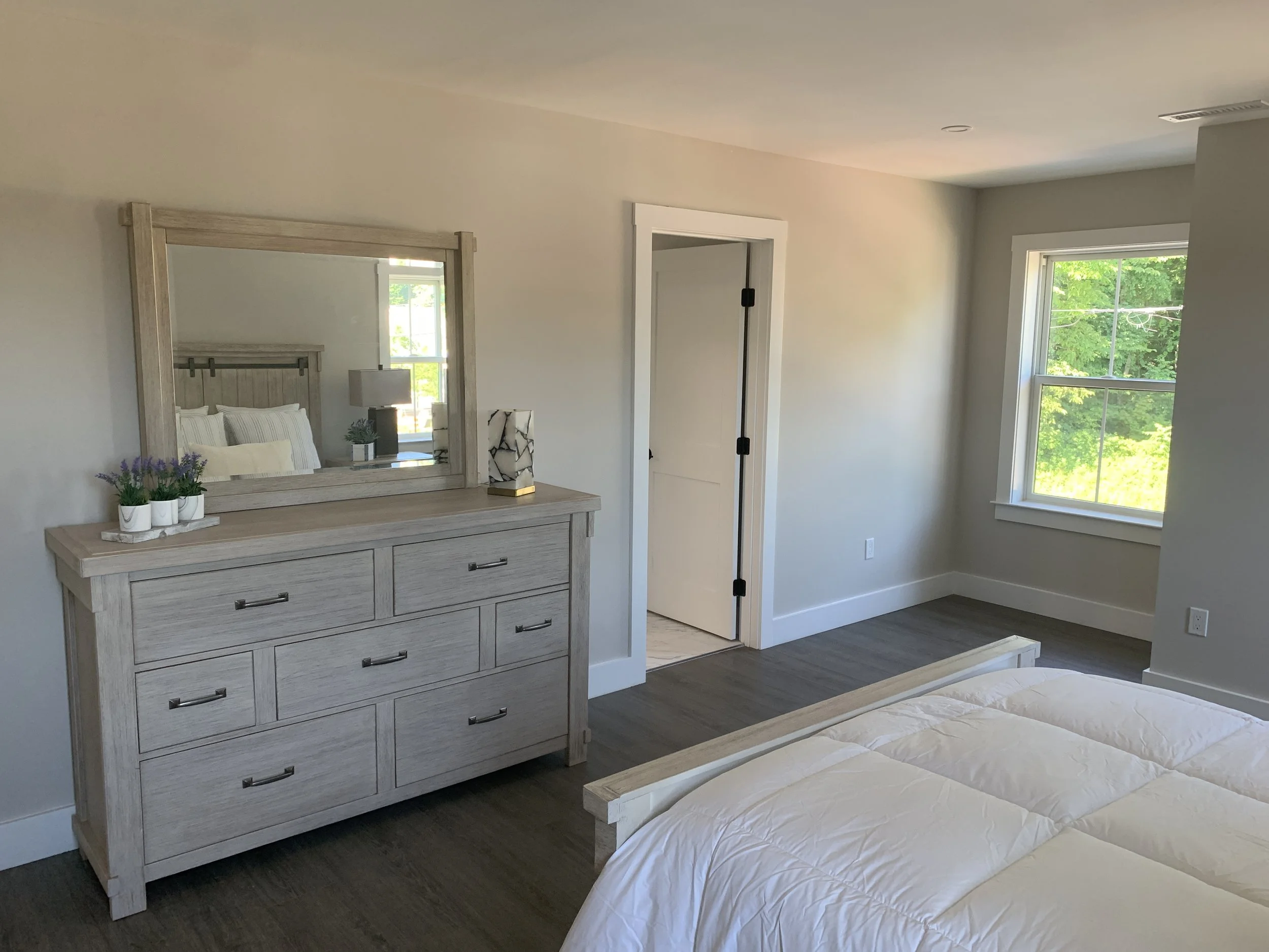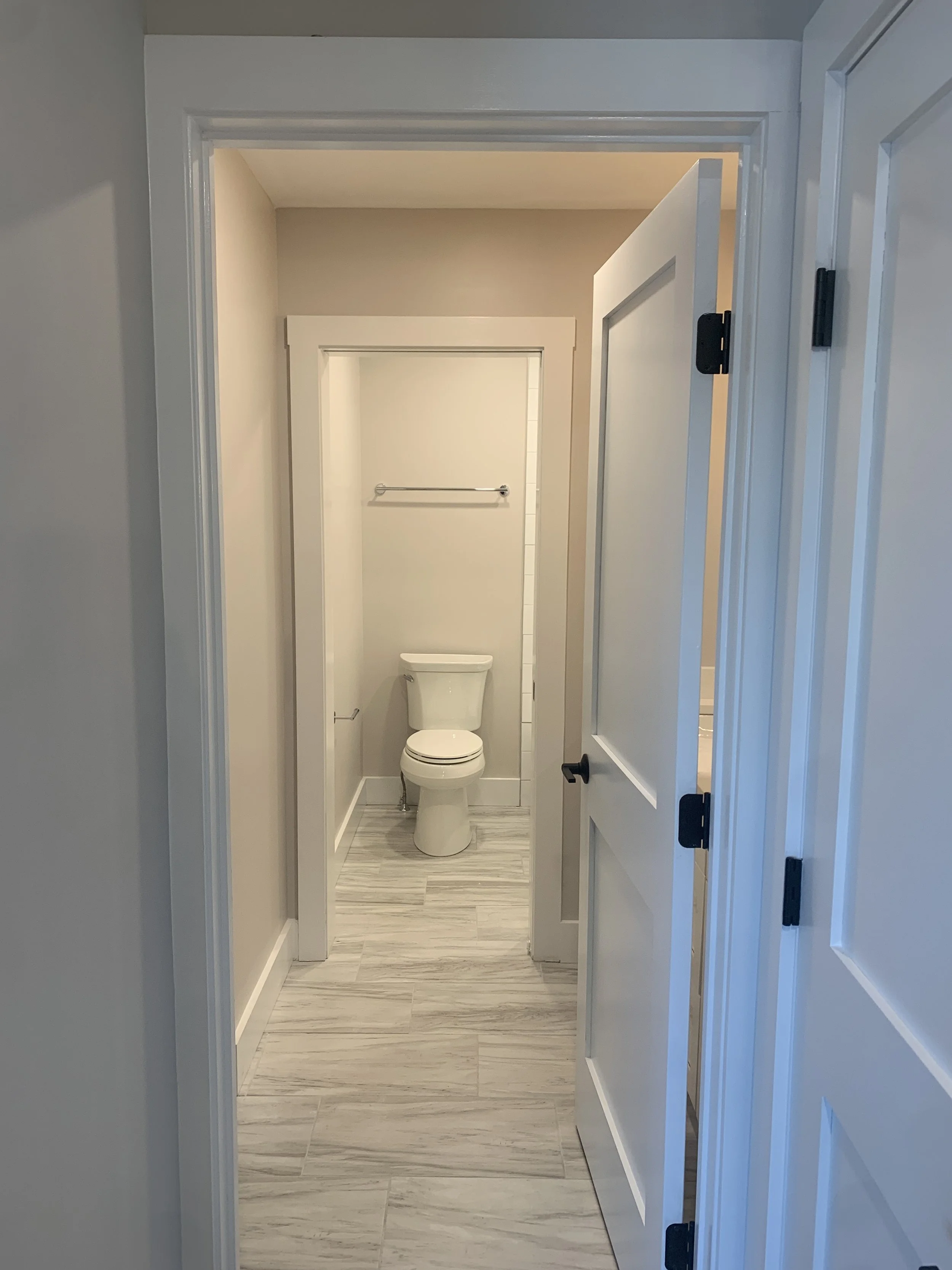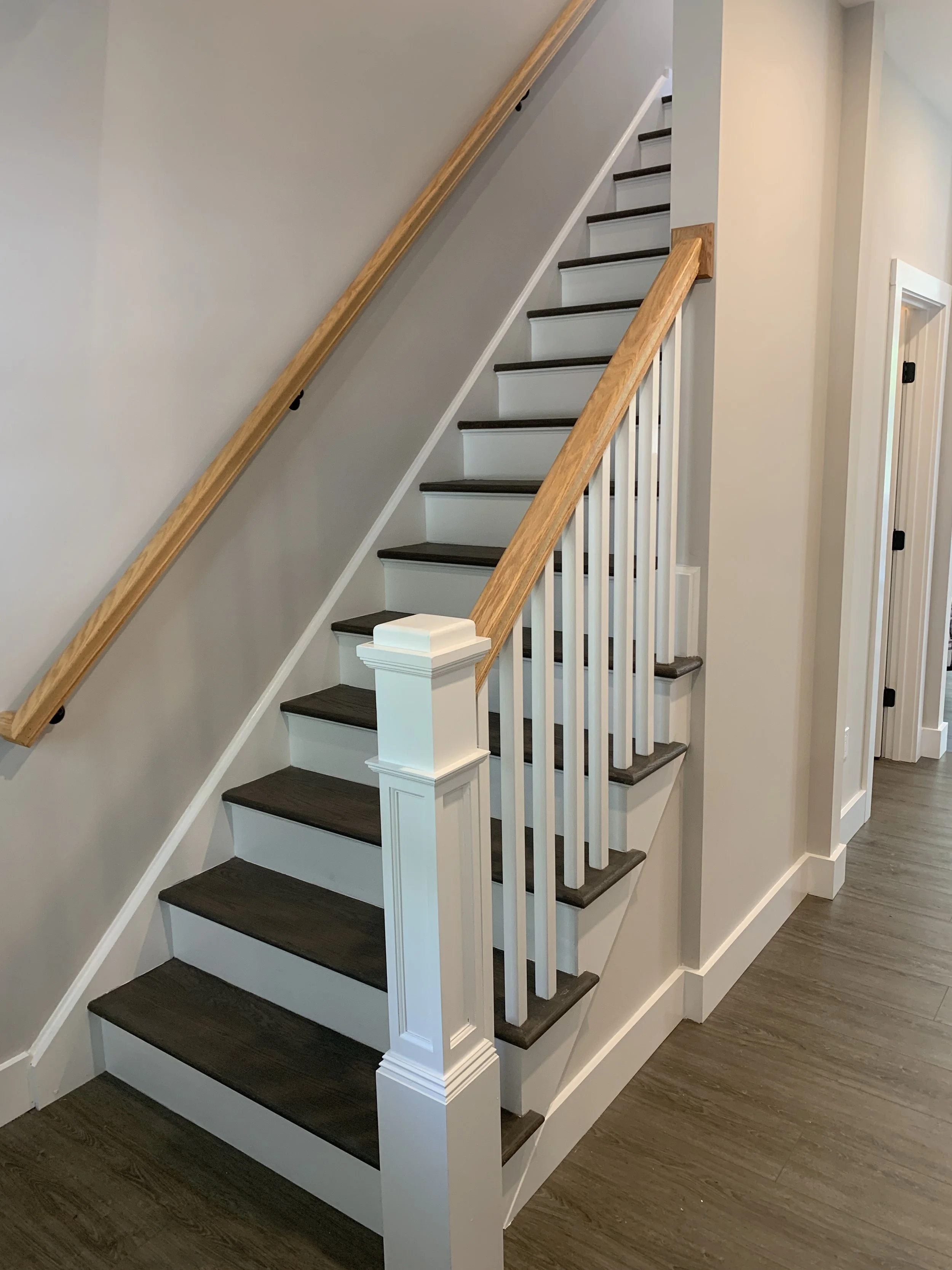 We completed a full trim installation from hanging doors and building window extension jambs to installing kitchen cabinets and bathroom vanities. We installed 1x6 base molding and 1x4 door and window casing.