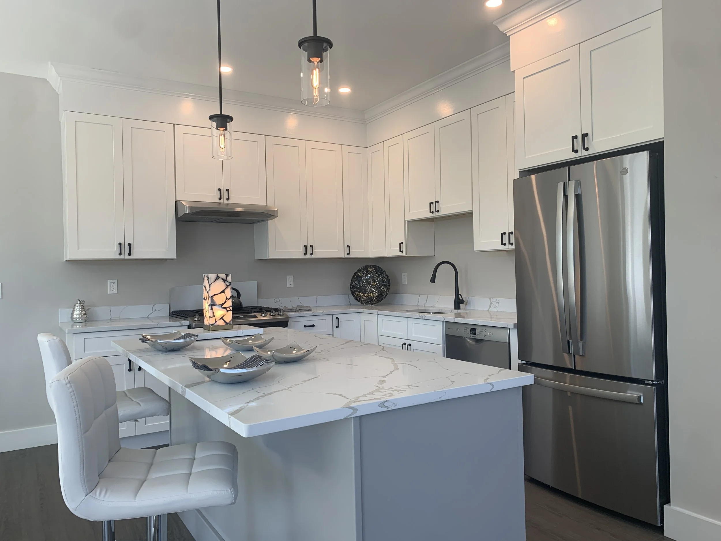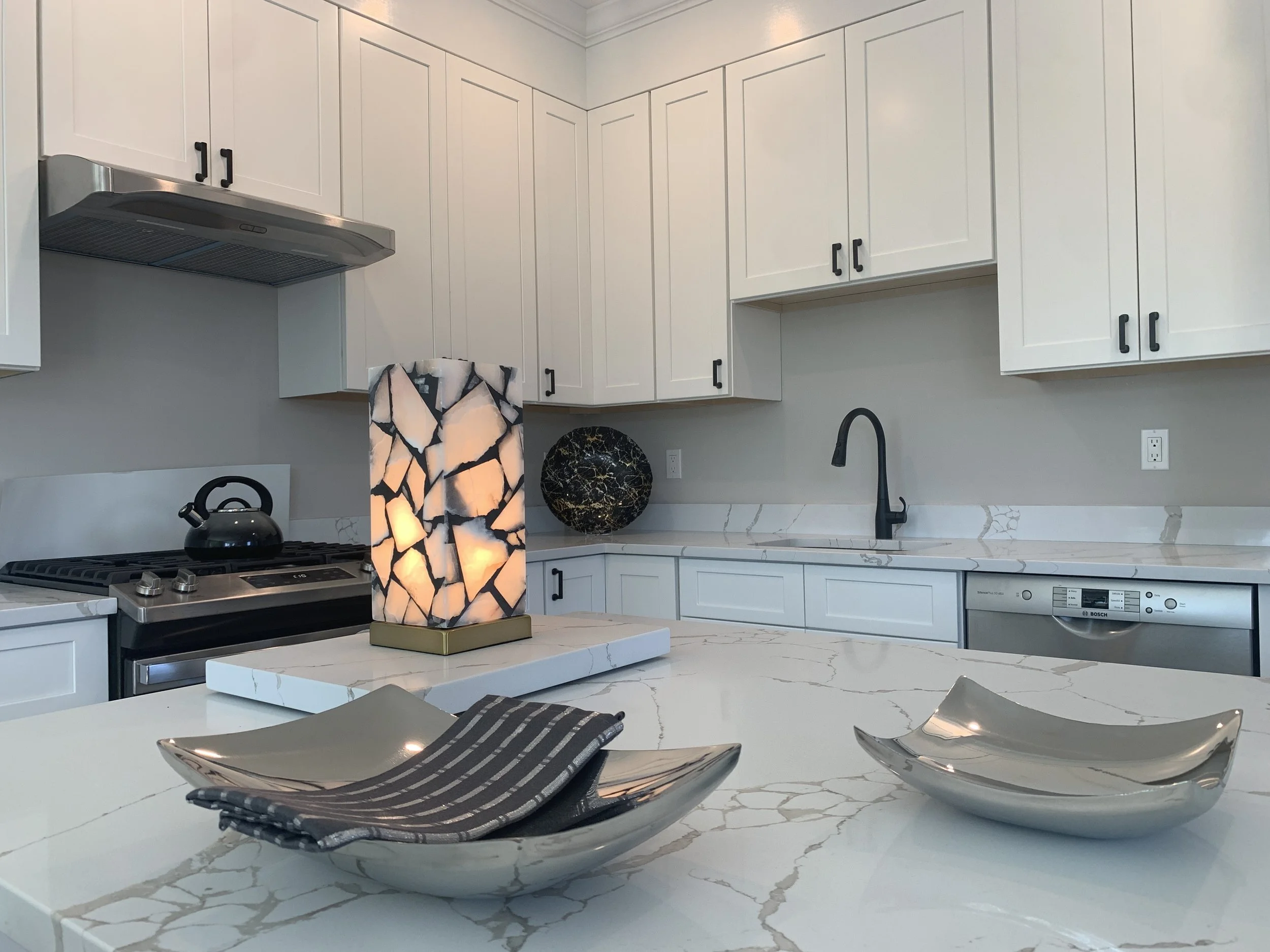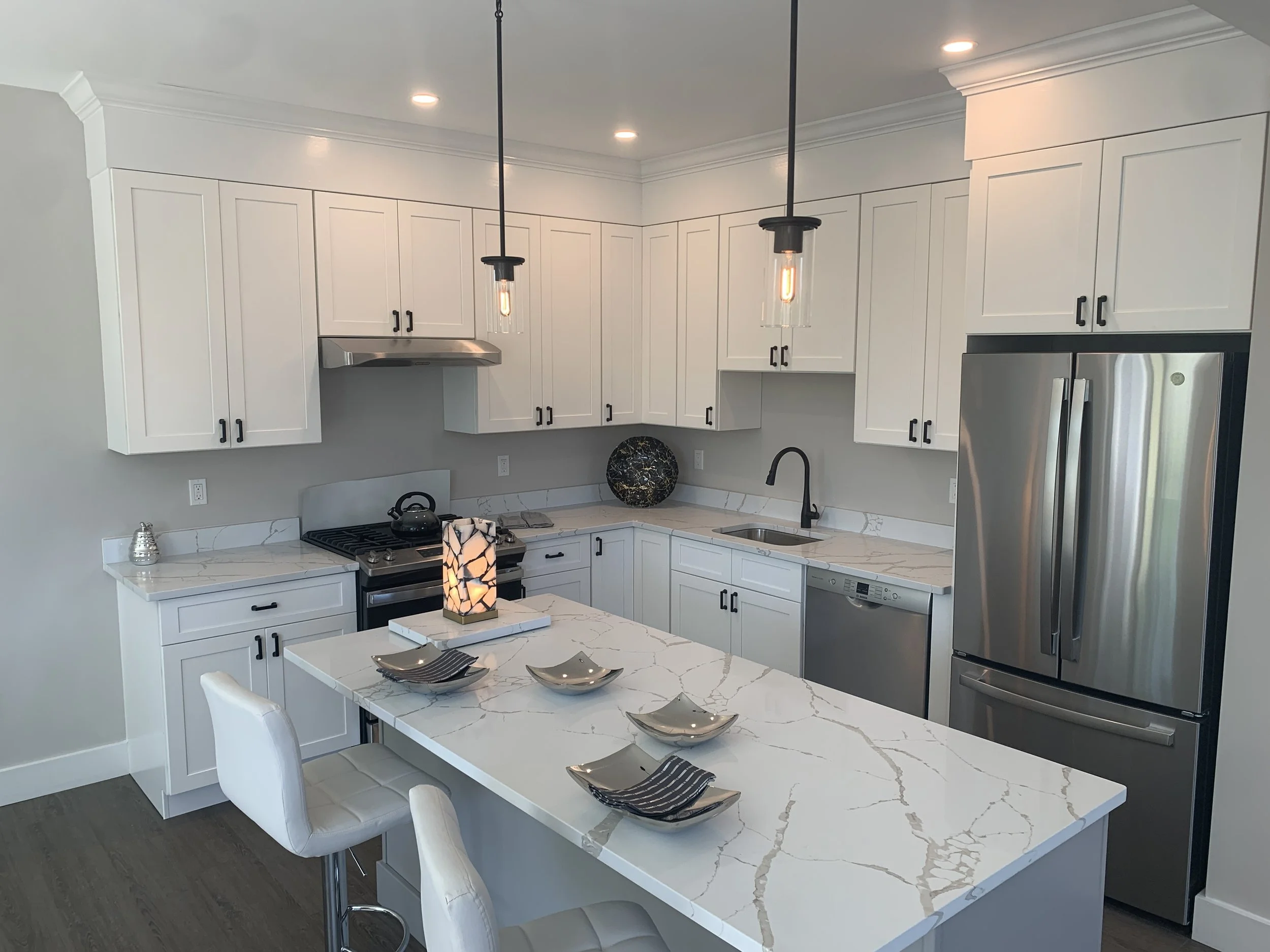 Kitchen cabinet, soffit and crown molding, and hardware installation.
