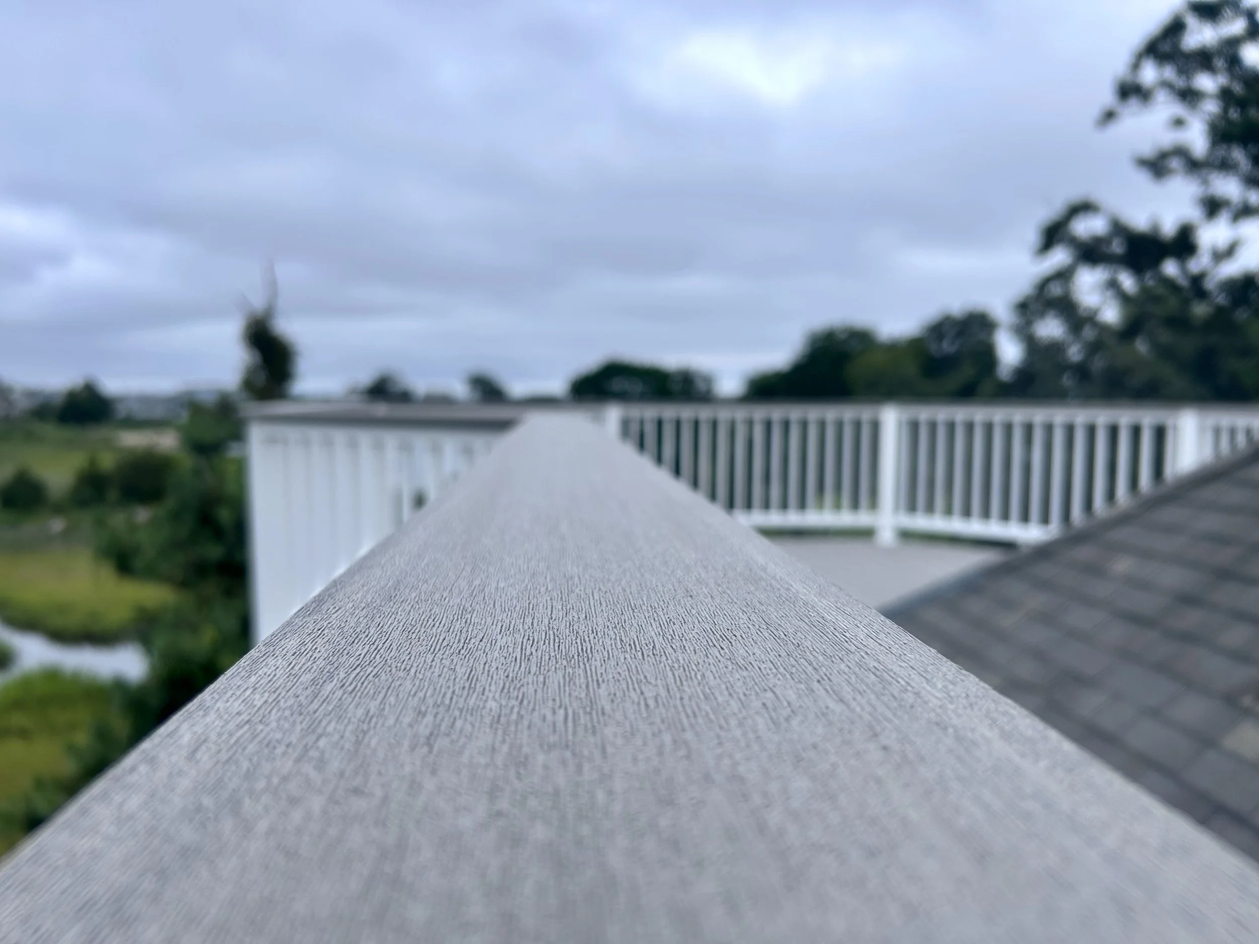 We reframed the flat roof below the deck, installed a new rubber roof membrane, and then installed TimberTech Vintage Coastline decking (our favorite!) with a drink rail that will surely be used!