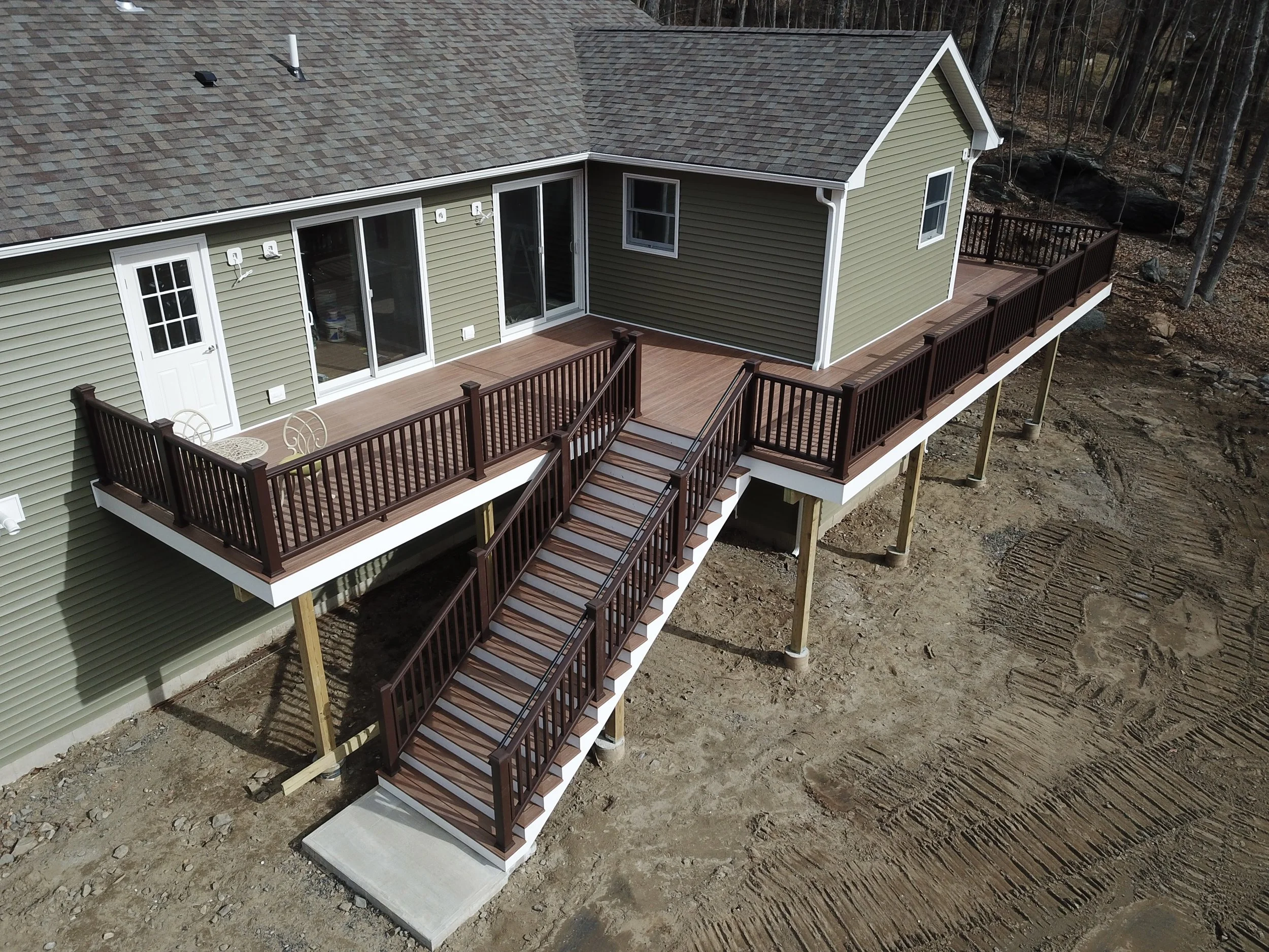 This sprawling deck was just over 730 sq. ft. and was a blast to build! We installed Trex Transcend composite decking in Havana Gold and Trex Transcend railings in Vintage Lantern.